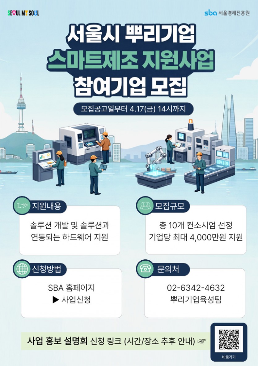 서울시 뿌리기업의 스마트 제조 환경 구축 및 디지털 혁신 강화를 위한 「2026년도 서울시 뿌리기업 스마트제조 지원」 사업을 다음과 같이 공고하오니 스마트 솔루션 구축을 희망하는 기업의 많은 참여를 바랍니다.